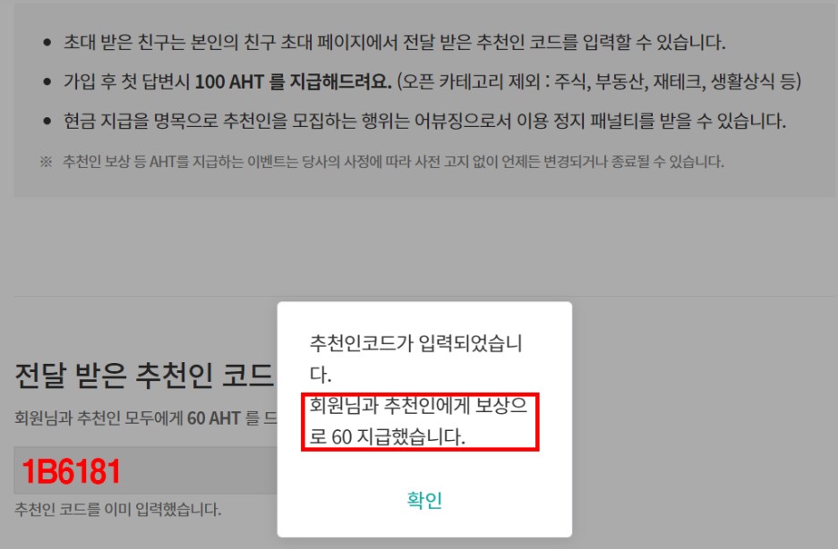 1B6181을 입력해주세요 제 추천인 코드로 추천인을 입력하시면 추천한 사람과 추천한 사람 모두에게 60아하 코인이 지급됩니다.