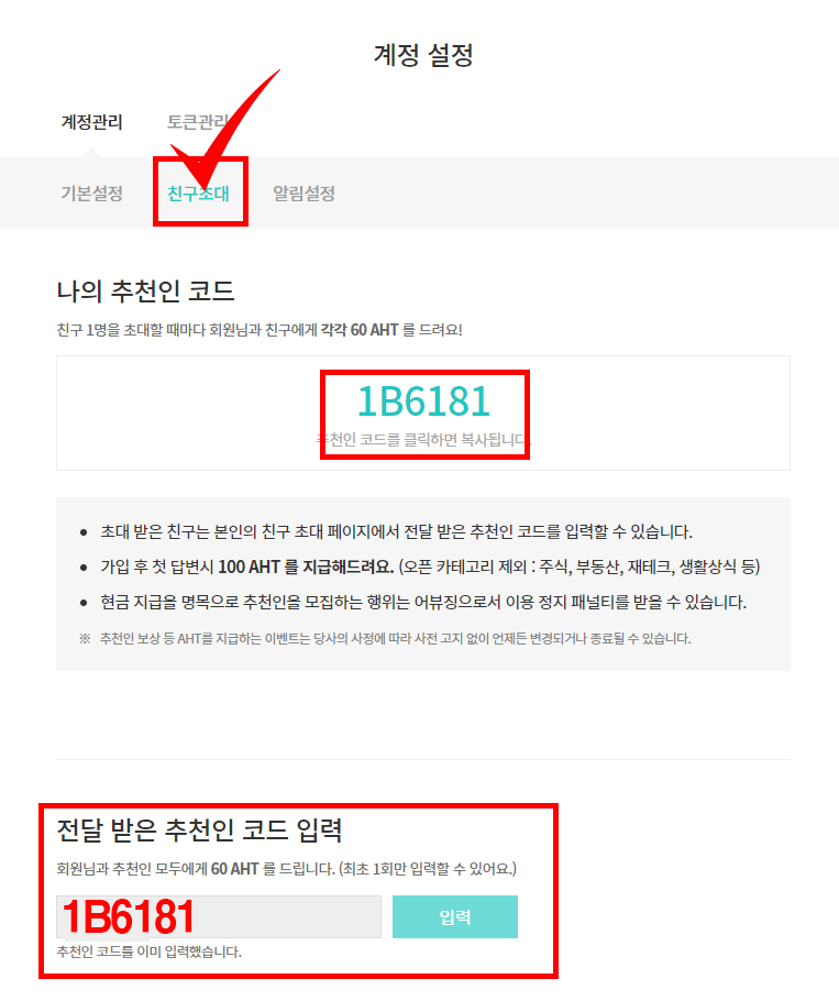 2.계정 설정 페이지에 친구초대 카테고리 하단에 전달받은 추천인 코드 입력에