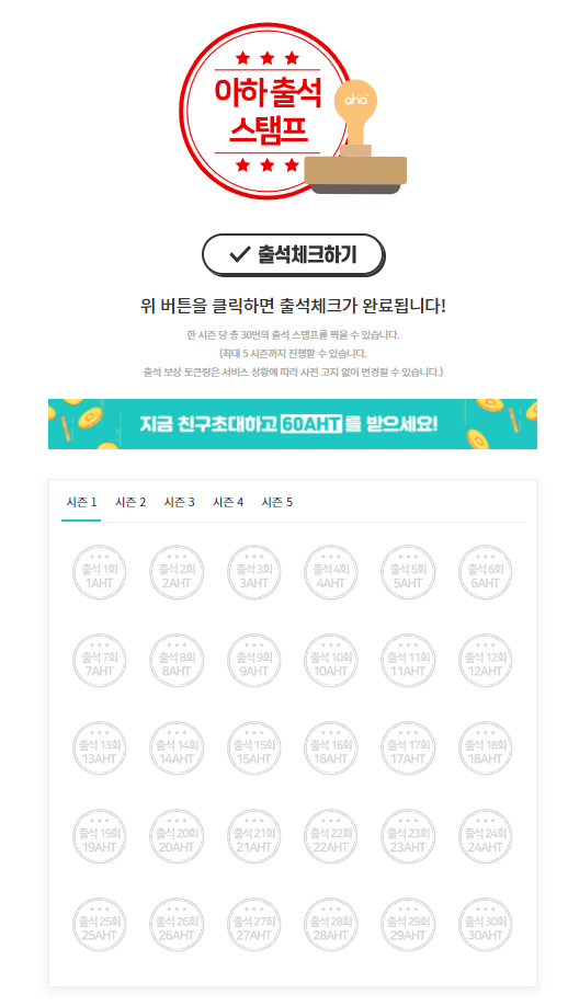 30일 동안 출석체크를 해주셔야 하며, 총 475개의 아하 토큰을 받을 수 있는 출석체크의 경우 5개의 시즌으로 나뉘어 진행할 수 있습니다. 아하 톤은의 경우 업비트의 가상화폐 가격에 따라 얻을 수 있는 가격이 달라짐으로 보유후 차후에 거래를 하셔도 되며, 바로 거래하여 현금화시키실 수도 있습니다.